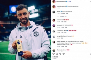 B費(fèi)也在賽后通過社媒曬出自己手捧英超官方全場MVP獎(jiǎng)杯的照片,并配文:“繼續(xù)保持當(dāng)前的勢頭!”