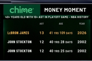 轉(zhuǎn)播方曬出統(tǒng)計(jì),詹姆斯今日13次助攻刷新了歷史上40歲球員季后賽單場(chǎng)助攻紀(jì)錄,此前是斯托克頓的12次。