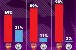 OPTA對三種賽果對爭冠的影響進行了預測,若曼城贏球,阿森納奪冠概率仍有69%,而若阿森納贏球,奪冠概率將升至98%。