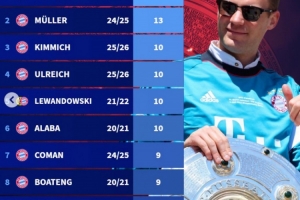 體育資訊4月20日訊 德甲第30輪比賽,拜仁以4-2的比分戰(zhàn)勝斯圖加特鎖定本賽季的德甲冠軍,諾伊爾、基米希、烏爾賴希等人再添一個德甲冠軍獎牌。德國轉(zhuǎn)會市場盤點了球員德甲獲得德甲冠軍的數(shù)量,諾伊爾和穆勒均拿到13個德甲冠軍并列榜首,前10均為拜仁球員。