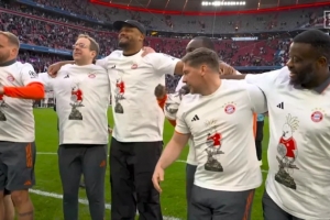 今天凌晨,拜仁4-2擊敗斯圖加特,將隊史第35座聯(lián)賽冠軍完美收入囊中。賽后,安聯(lián)球場內洋溢著狂歡的氣氛,而主角是一件極其特別的紀念衫。
